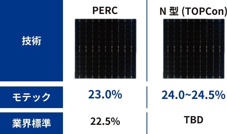 MOTECHは変換効率の高いセル技術(PERC、N型TOPCon)を使用しており、業界標準を上回る23.0%から24.5%の変換効率を達成しています。