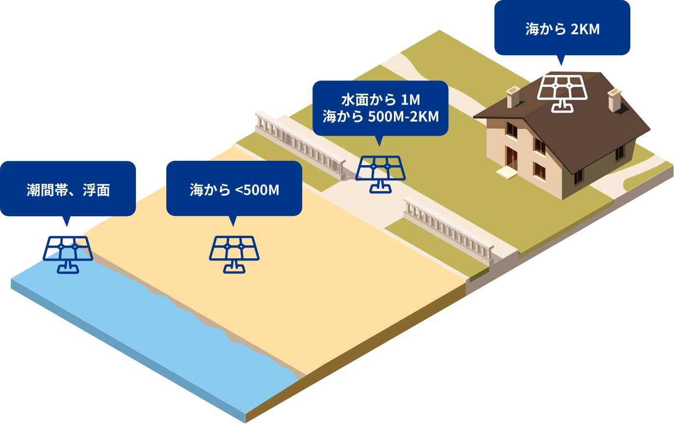 海から500M-2KM海から2KM 種類 両面ガラス 単面ガラス 単面ガラス 単面ガラス 封止材 POE POE POE or EVA EVA バックシート ガラス 低透水性バックシート 低透水性バックシート 低透水性バックシート フレームアルマイト処理 AA15 AA15 AA20 AA20 -