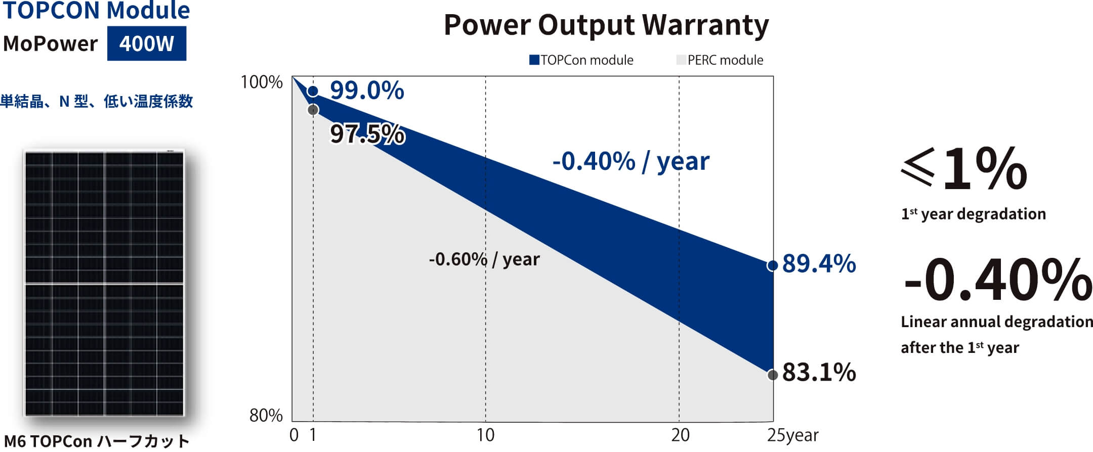TOPConモジュール[MoPower400W]は、単結晶・N型・低い温度係数という特徴があります。